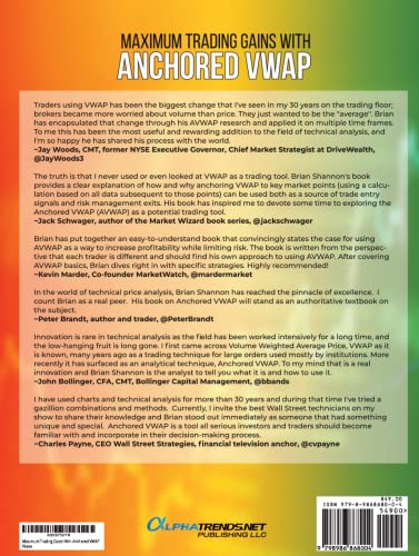 Author Brian Shannon, CMT, explains how to use the Anchored VWAP (AVWAP) to make better entries and exits, to time breakouts and breakdowns, and to set stop losses. Both new and experienced traders and investors will appreciate the book’s insights and systematic approach to using AVWAP in a variety of situations including IPOs, support and resistance, market direction, short sales and squeezes, and financial news.